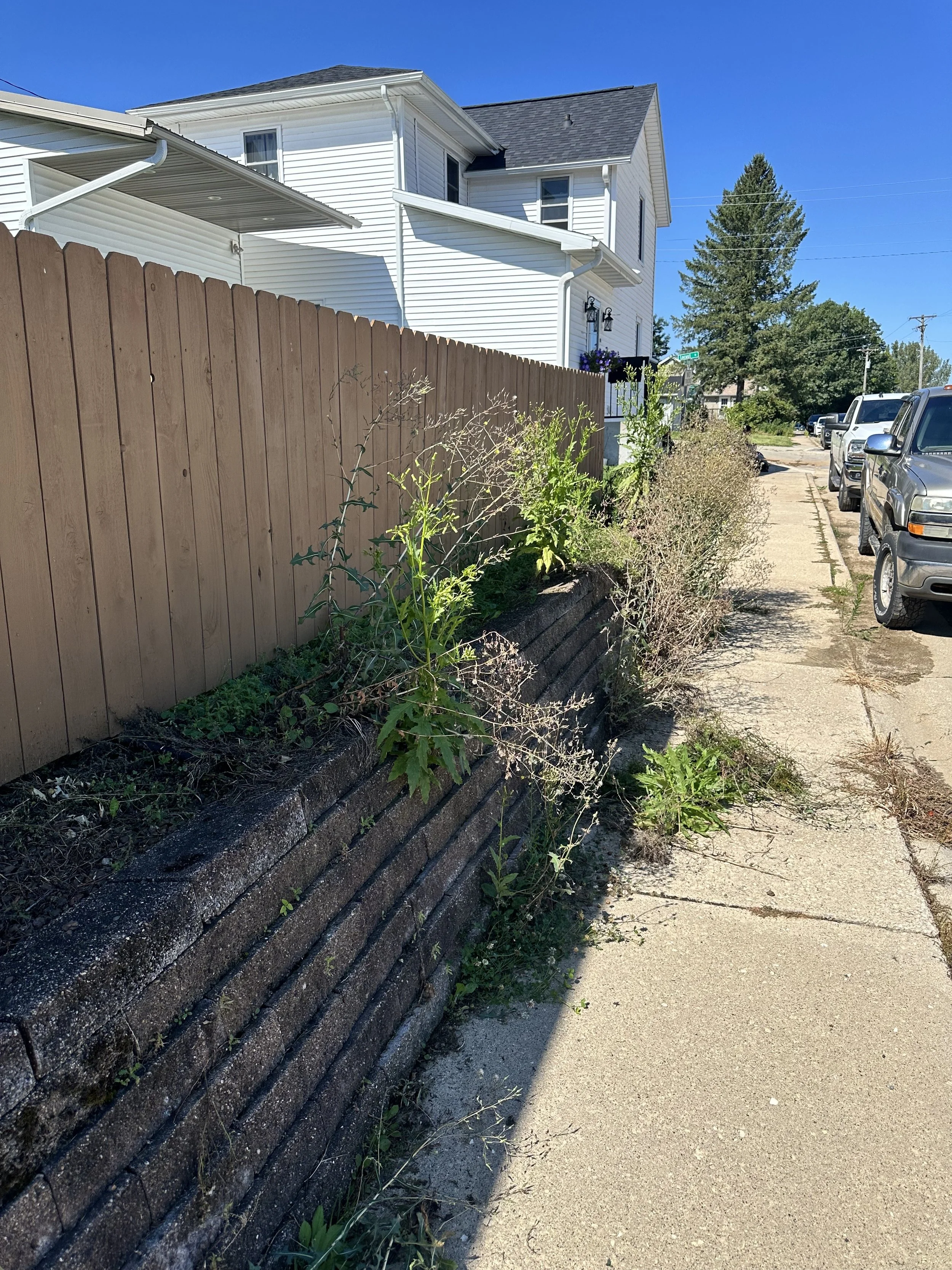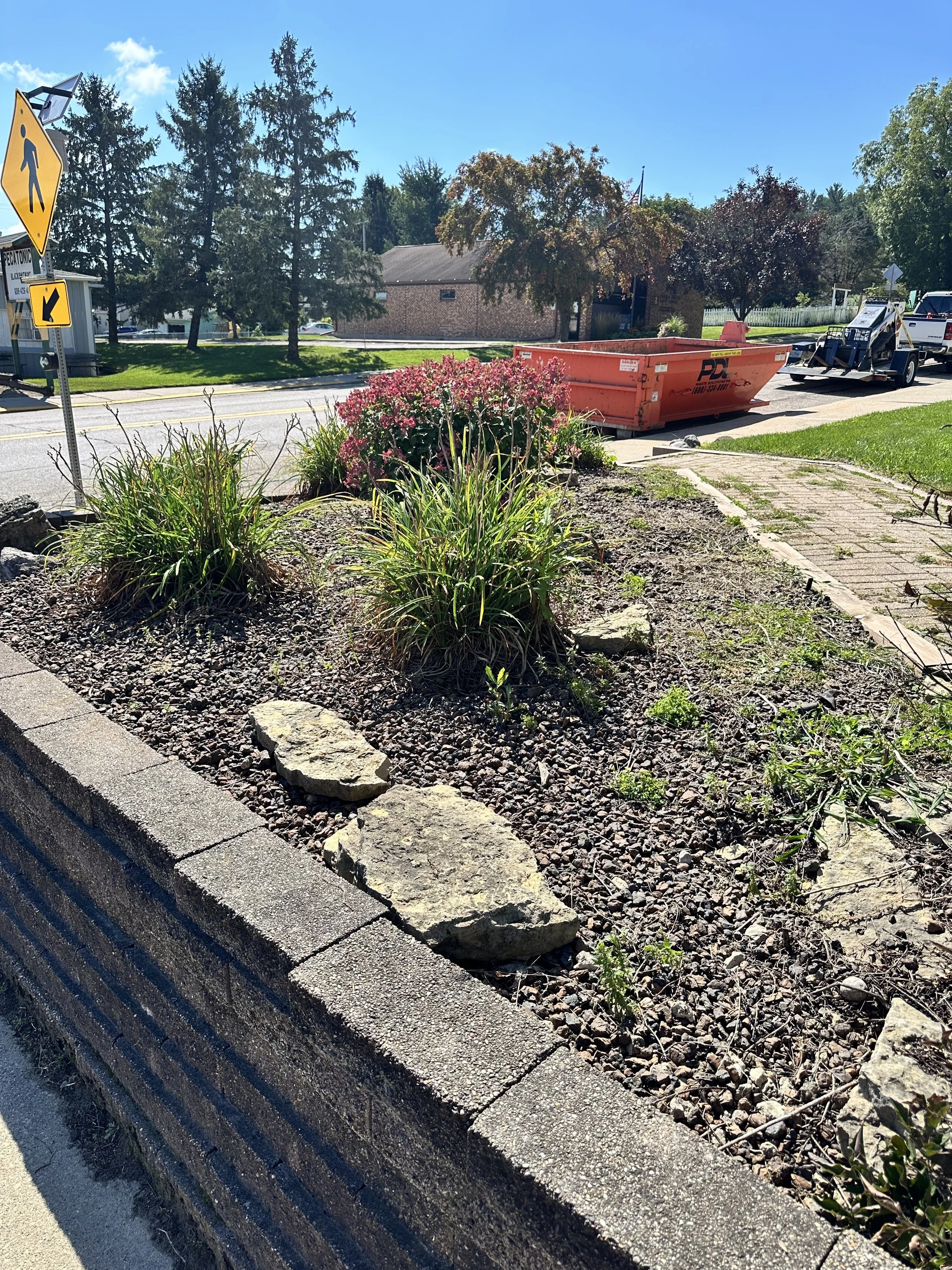 Removal of all weeds, installation of new weed barrier fabric, & installation of 3 cubic yards of mulch.